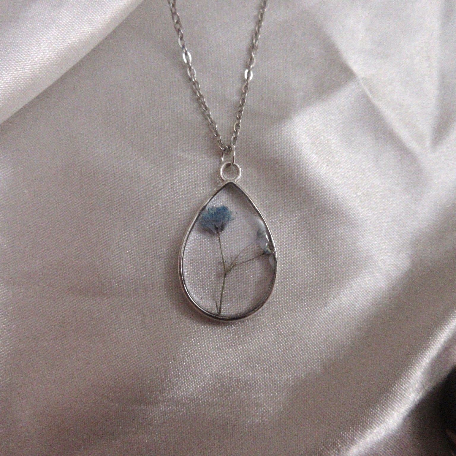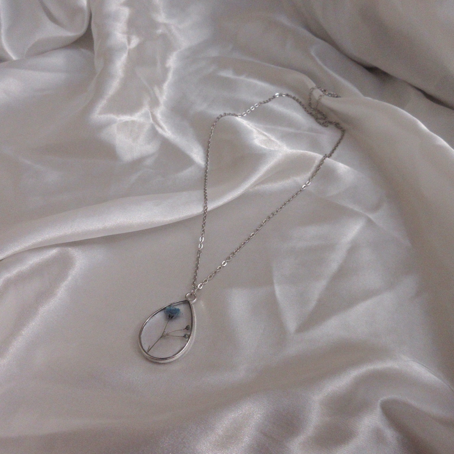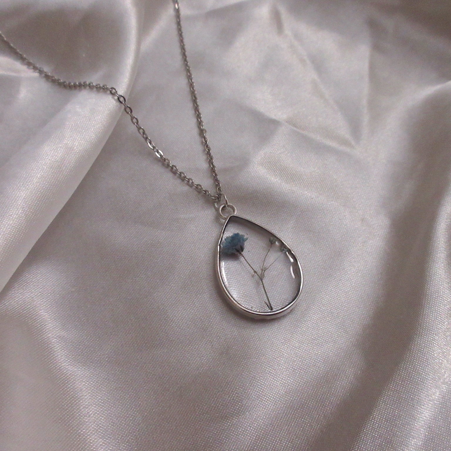 A delicate flower, frozen in time. This teardrop shaped necklace features a tiny sprig of blue dyed baby’s breath carefully preserved in clear resin.