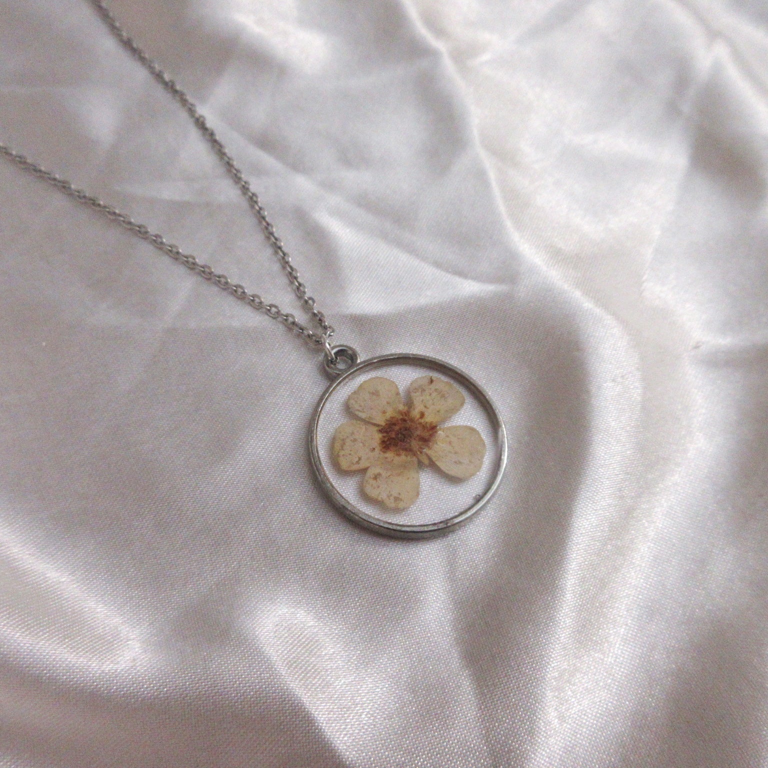 A faded yellow buttercup, preserved in resin, in a circular pendant. Suspended from a durable stainless steel chain, this piece is both delicate and strong.