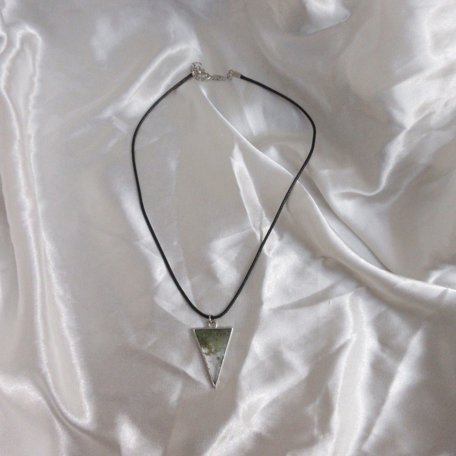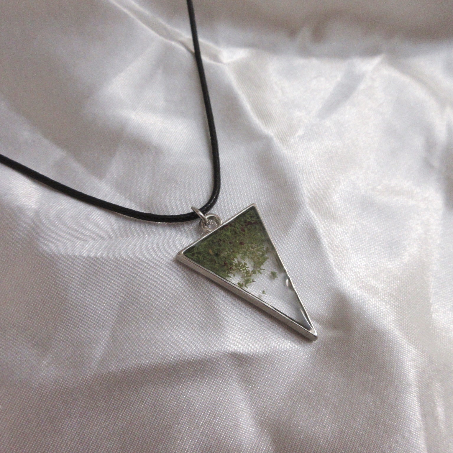 A fragment of forest floor, forever preserved. This triangle-shaped pendant holds dried moss, set in clear resin. Hung on an adjustable soft leather cord.