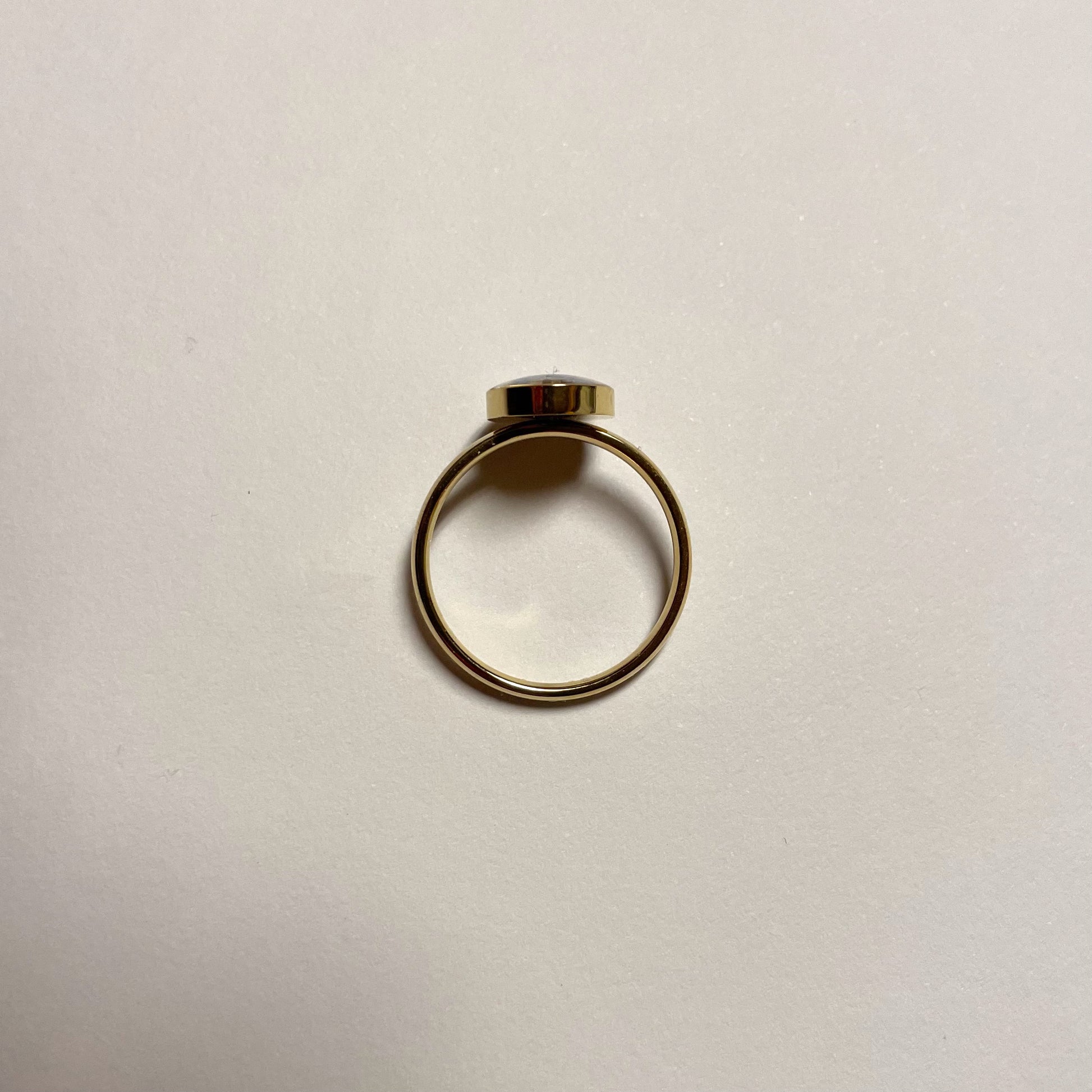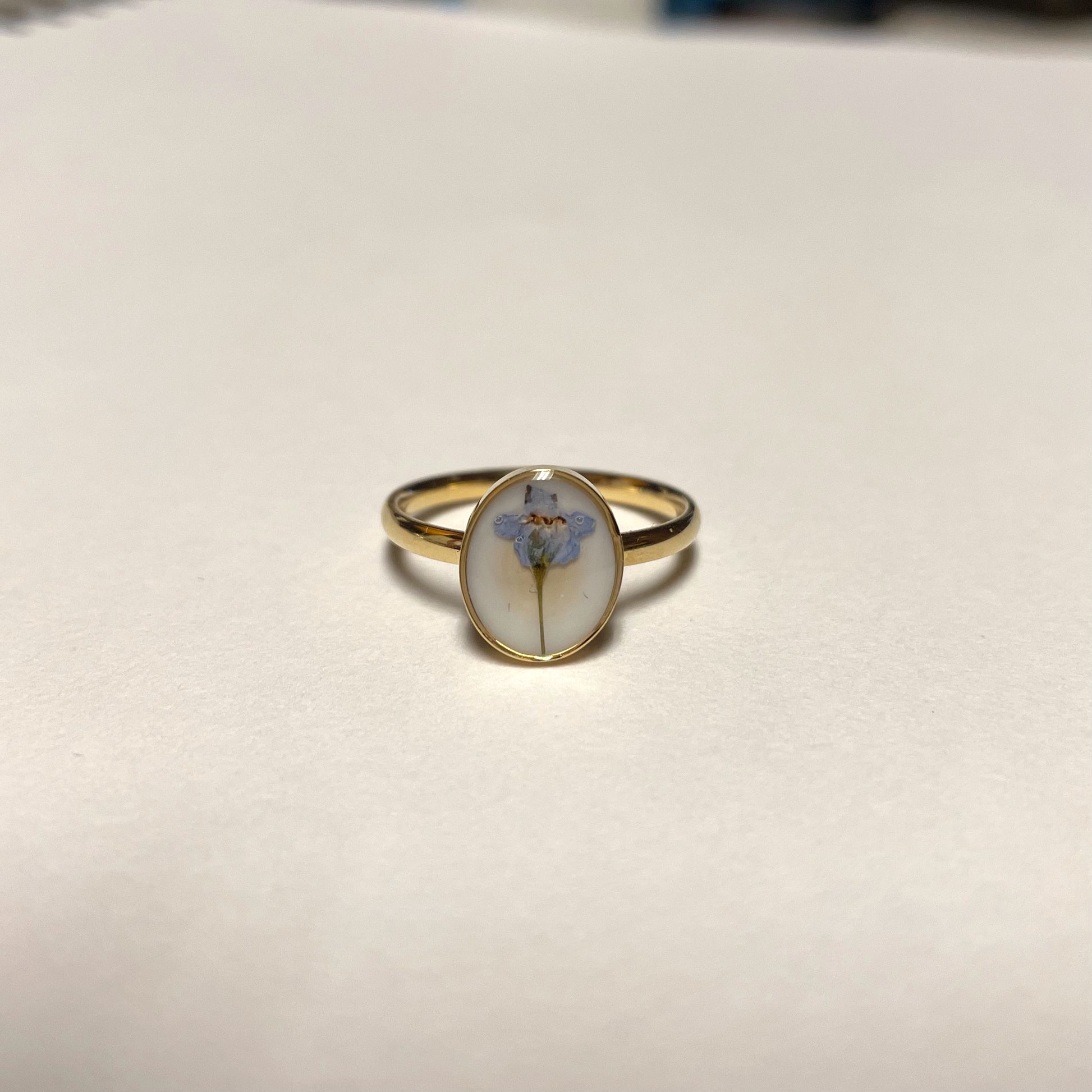 This ring is handmade with a real pressed flower, carefully preserved in clear resin and set in a gold-plated stainless steel band.